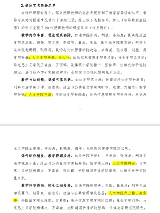 2024-2025学年春季学期,学校本科教学督导组继续深入课堂一线,认真开展教学督导、指导和质量监控工作。在最新发布的国产主播 本科教学督导工作简报中,国产主播 李驰、王心竹、王洪、韩达、郑云艳、高文婷等多位教师被实名表扬;高文婷老师因高质量的讲授通识选修课《声乐艺术赏析与实践》,被督导在附件里以独立段落特别表扬。
